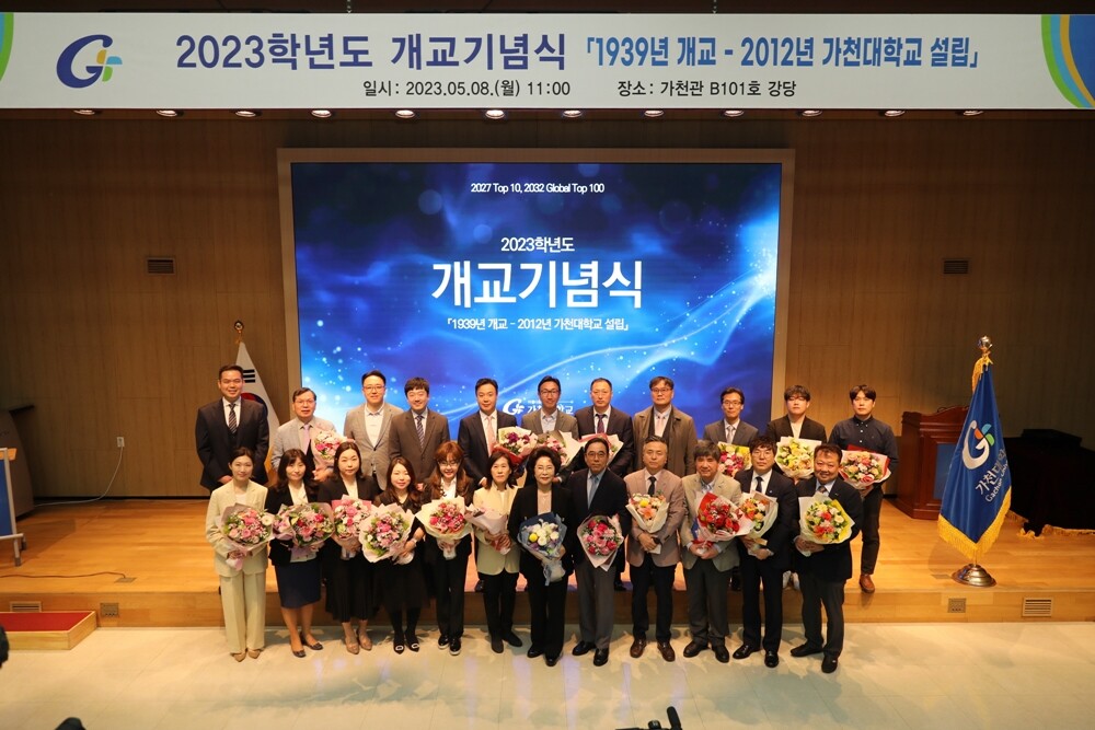 가천대 관계자들이 8일 대학 가천관에서 개교 84주년 기념식을 한 후 기념촬영하고 있다. 사진=가천대 제공 |