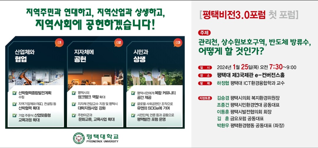 패널토론에는 김승겸 평택시의회 복지환경위원장, 조종건 평택시민환경연대 공동대표, 이동훈 평택시발전협의회 회장, 김훈 금요포럼 공동대표 등이 참석하며, 전 평택시의원인 박환우 평택환경행동 공동대표가 좌장을 맡는다.