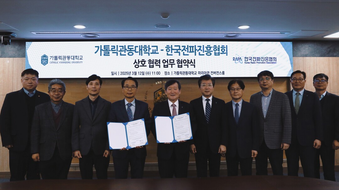 [대학저널 이선용 기자] 가톨릭관동대학교는 12일 오전 11시 대학 마리아관 4층 컨버전스룸에서 한국전파진흥협회와 ICT 분야 인재 양성을 위한 업무협약을 체결했다고 밝혔다.