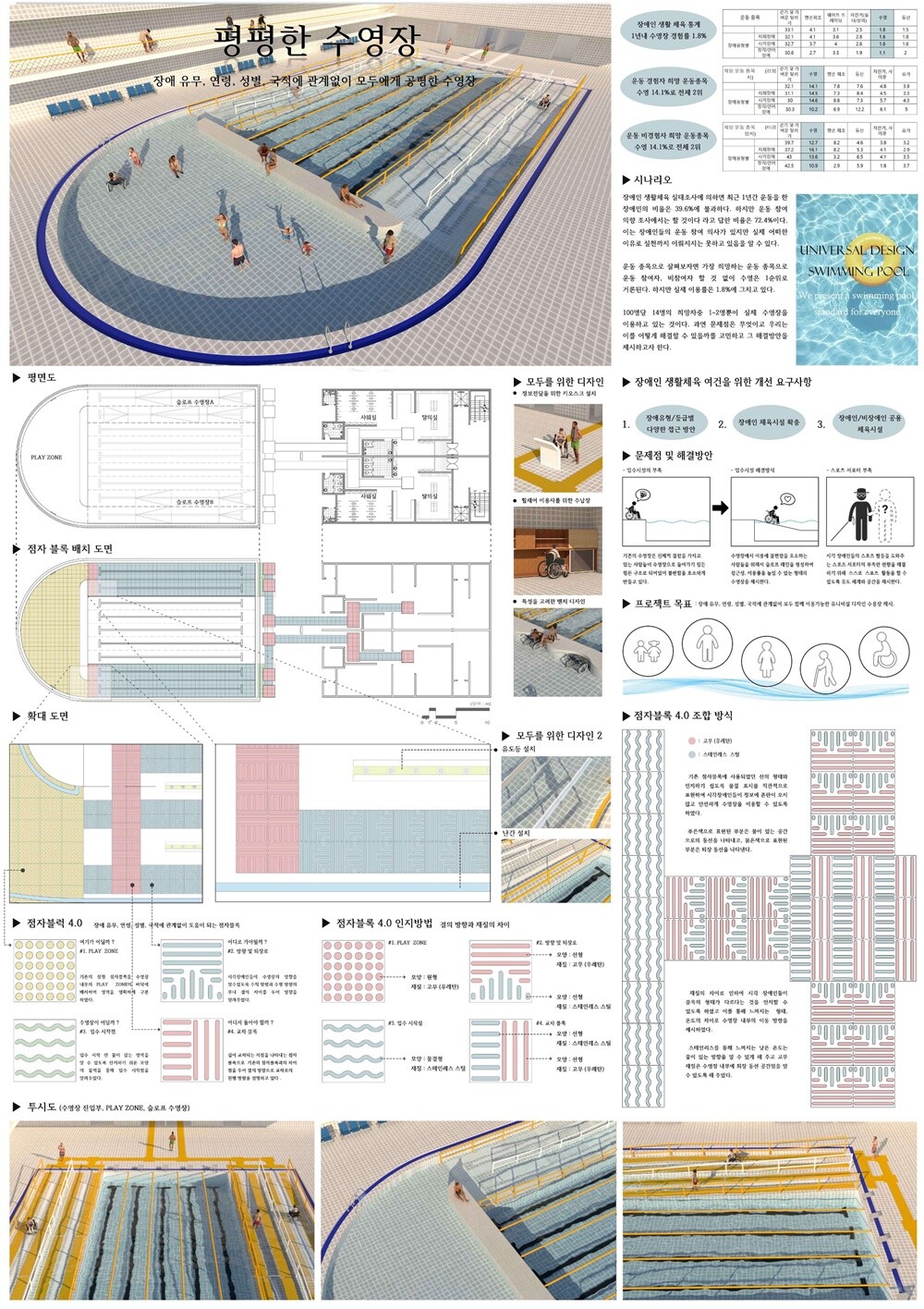수상 학생들은 ‘모두를 잇다, 있다’라는 특별주제로 진행된 이번 대전에 기존의 수영시설이 가지고 있는 장애 요소들을 해결하고 모두 함께 어우러져 사용 가능한 유니버설 수영장 디자인을 구현했다.