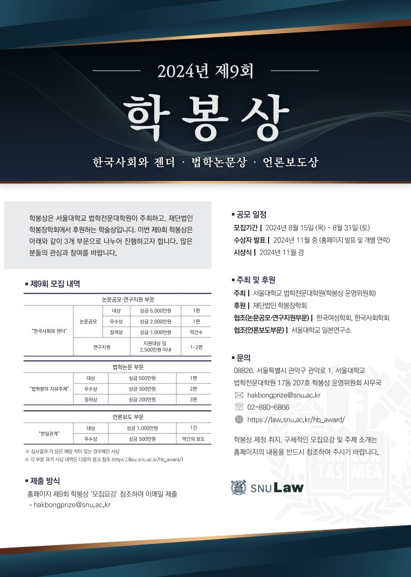 [대학저널 이선용 기자] 서울대학교 법학전문대학원(이하 로스쿨)이 2024년 제9회 학봉상 수상 후보를 모집한다.