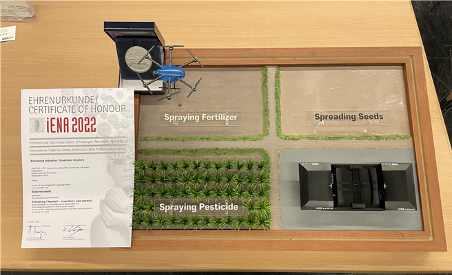 은상을 수상한 김 교수의 ‘스마트 농업을 위한 무인/자율 농업 드론 스테이션은 서비스 플랫폼’은 노지 농업에서 볍씨 등 종자 뿌리기, 비료 및 농약 살포 등 작업을 컴퓨터에 입력된 일정에 의해 농업 드론이 24시간 무인자동으로 작업할 수 있도록 개발됐다.