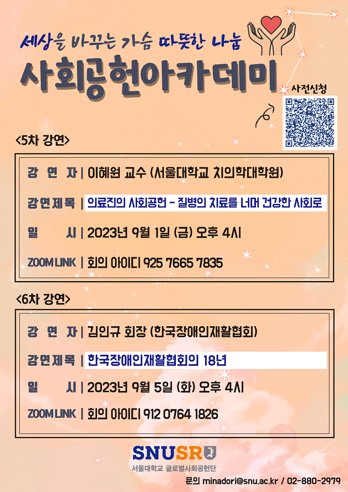 제5차 사회공헌아카데미는 9월 1일 오후 4시 이혜원 교수(서울대 치의학대학원)가“의료진의 사회공헌 - 질병의 치료를 너머 건강한 사회로”라는 주제로 의료 분야의 사회공헌과 관련된 강연을 진행할 예정이다.