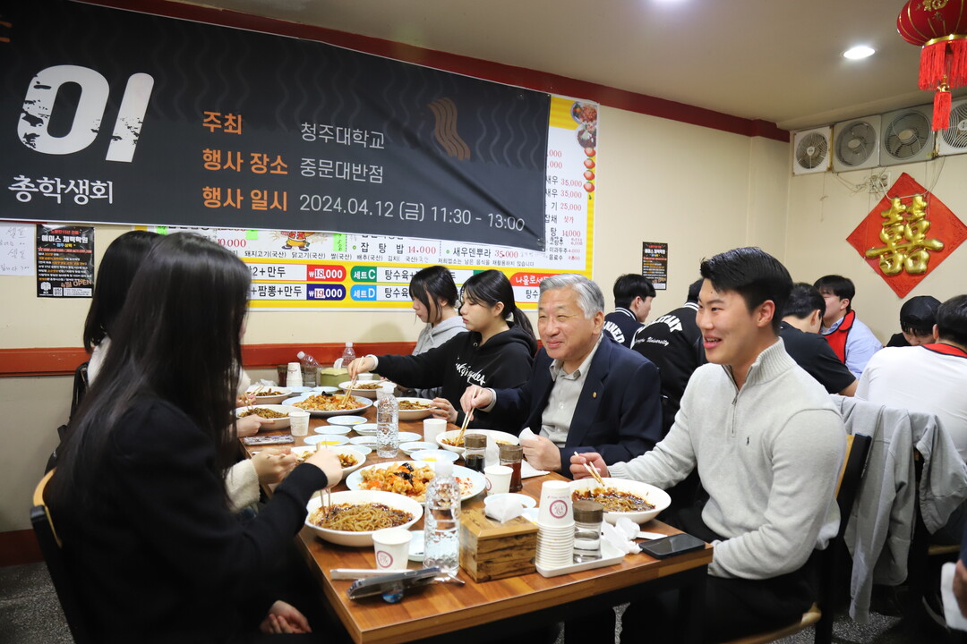 김윤배 총장은 12일 청주대 인근 중국음식점에서 학생들과 함께 자장면을 먹으며 소통의 시간을 가졌다.