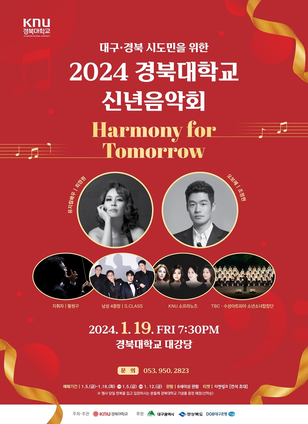 ‘내일을 위한 화합(Harmony for Tomorrow)’을 주제로 열리는 이번 신년음악회는 뮤지컬 배우 최정원을 비롯해 오보에 조정현, S.CLASS(남성 4중창), KNU소프라노즈(전선미, 곽보라, 구수민, 소은경), TBC·수성아트피아 소년소녀합창단 등이 출연한다. 지휘는 황원구 지휘자가, 연주는 오페라 전문 연주 단체인 디오오케스트라가 맡는다.