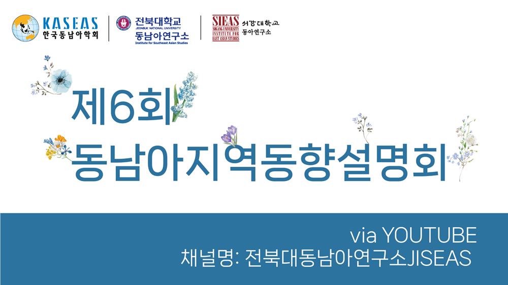 유튜브 채널명 ‘전북대동남아연구소 JISEAS’,‘제6회 동남아지역동향설명회’를 검색하면 말레이시아와 태국, 베트남, 인도네시아, 필리핀, 싱가포르, 미얀마, 아세안의 2023년 동향 및 2024년 전망을 살펴볼 수 있다.