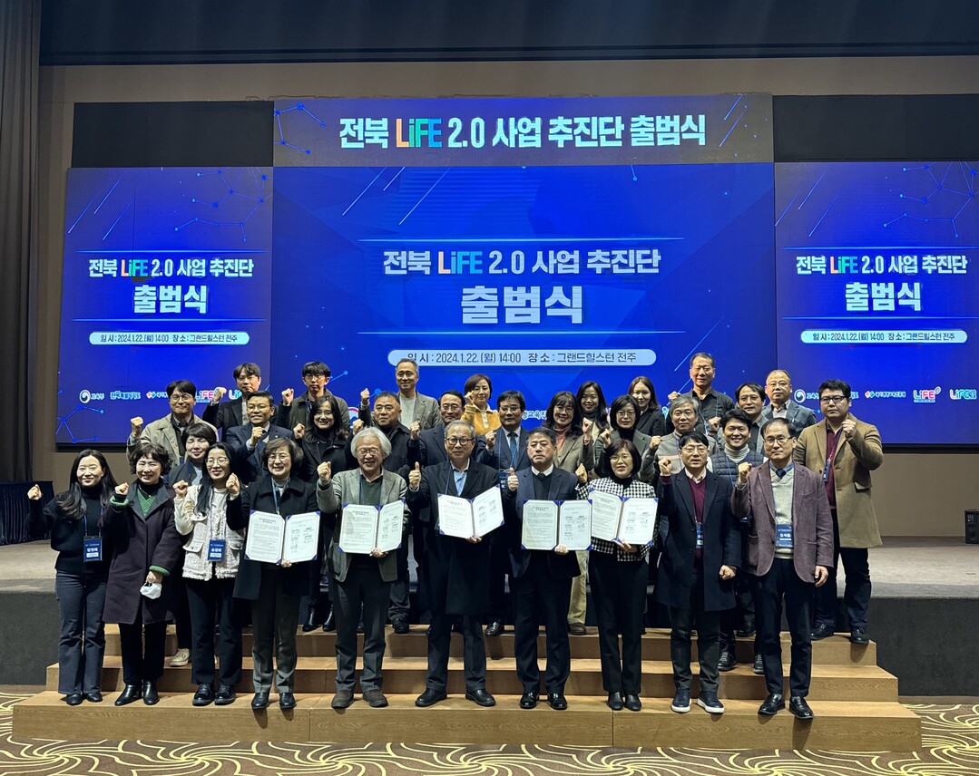 전북 LiFE 2.0 사업 추진단 출범식에서 참가자들이 기념촬영을 하고 있다. 사진=전주대 제공 |