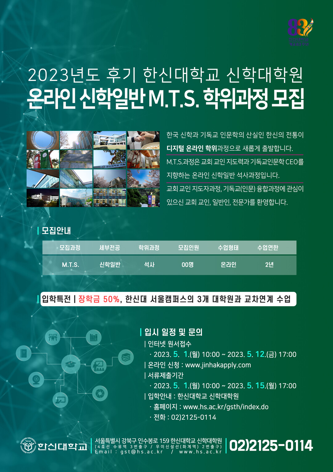 2023년 후기 온라인 신학석사 학위과정 모집은 5월 1~12일하며, 원서접수는 진학어플라이에서 가능하다. 자세한 사항은 한신대 서울캠퍼스 교학행정팀에 문의하면 된다.