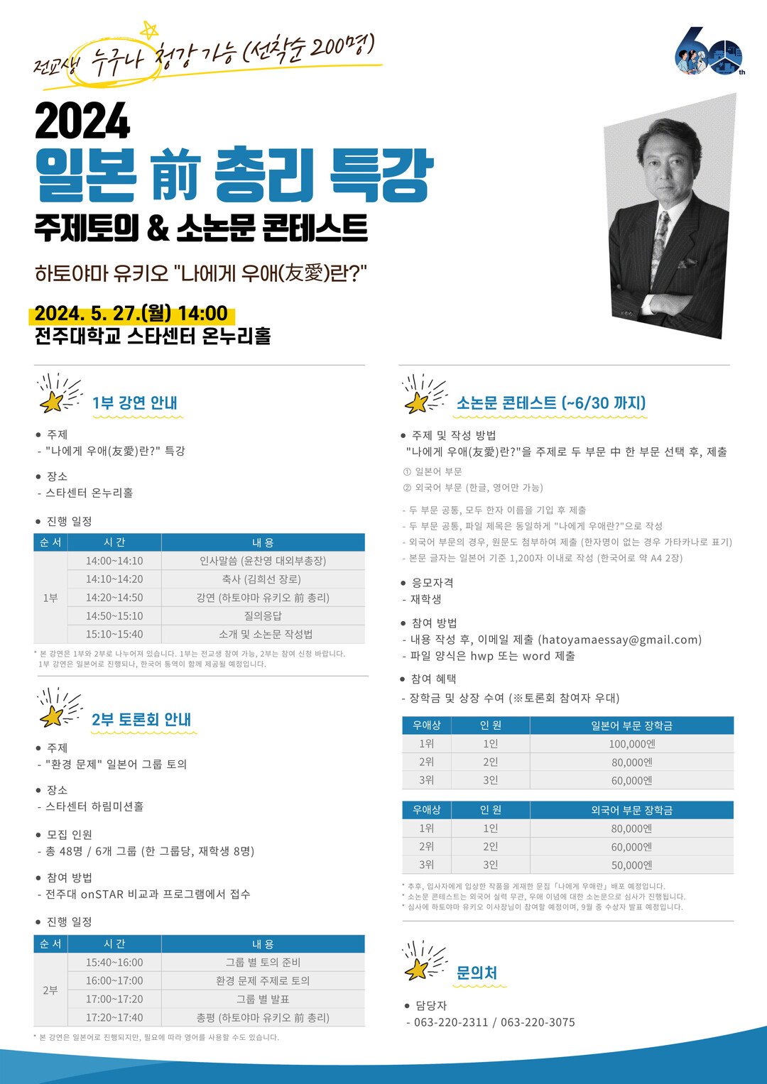 하토야마 유키오 일본 전 총리는 2023년 전주대에서 명예박사 학위를 받았으며, 이번 특강을 통해 전주대 학생들과 직접적인 교류를 진행할 예정이다. 이번 특강은 전주대에서 명예박사를 수여 받은 이후 진행되는 첫 번째 행사로서 많은 관심과 기대를 모으고 있다.