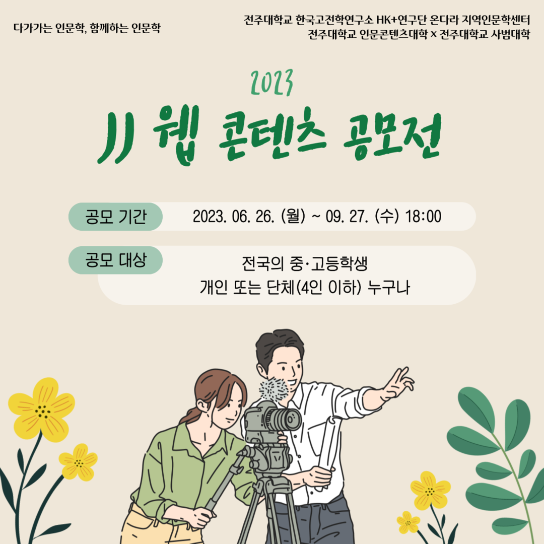 [대학저널 이선용 기자] 전주대 한국고전학연구소 HK+연구단 온다라 지역인문학센터는 인문콘텐츠대학, 사범대학이 공동 주관한 ‘2023 JJ 웹 콘텐츠 공모전’을 성황리에 종료됐다고 2일 밝혔다.