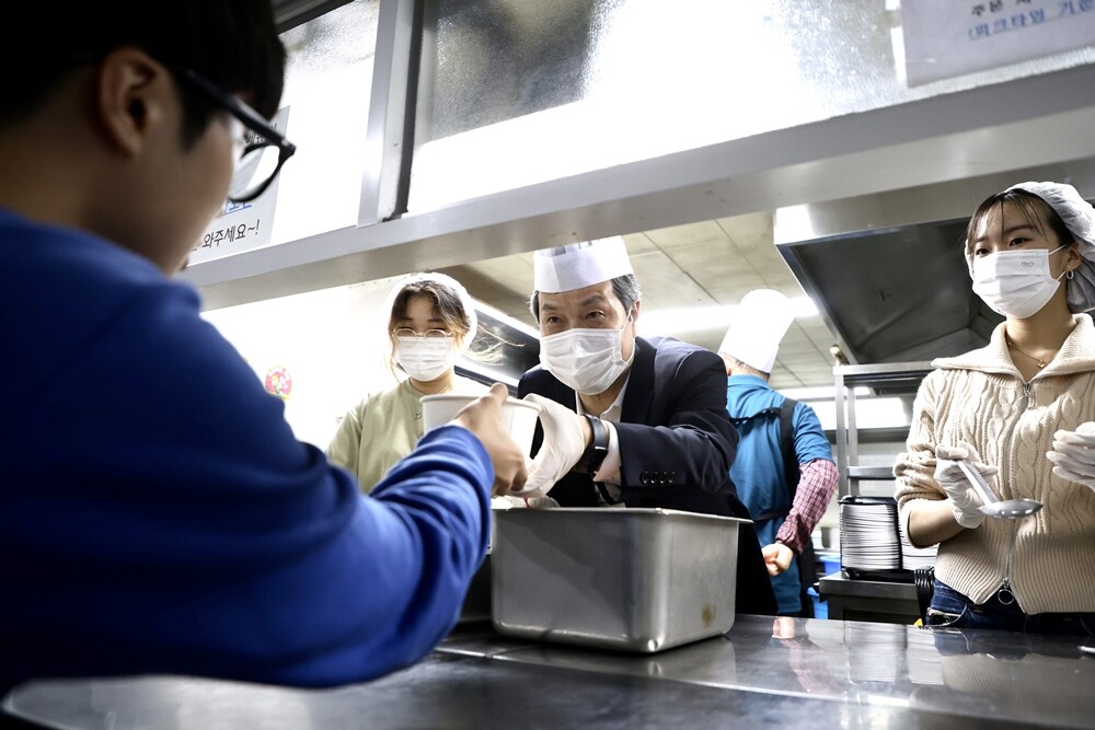원용걸 총장이 학생들에게 직접 저녁식사 배식을 하고 있다. 사진=서울시립대 제공 |
