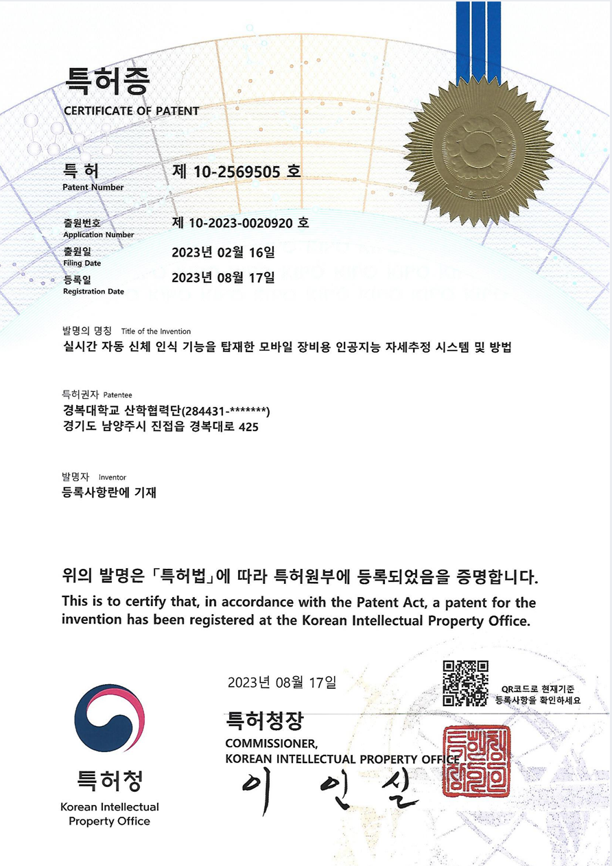 첫 번째 특허는 안승우와 최태석 학생이 캡스톤 디자인의 과제로 ‘실시간 자동 신체 인식을 가능하게 하는 모바일 장비용 인공지능 자세추정 시스템(Artificial intelligence posture estimation system for mobile devices equipped with automatic real-time body recognition function)’을 개발하고 특허를 등록(특허번호 : 제 10-2569505 호)했다. 이 시스템은 모바일 기기에 탑재되어 사용자의 신체 자세를 실시간으로 감지하고 분석함으로써, 자세 관련 문제를 예방하고 개선하는 데 도움을 준다.