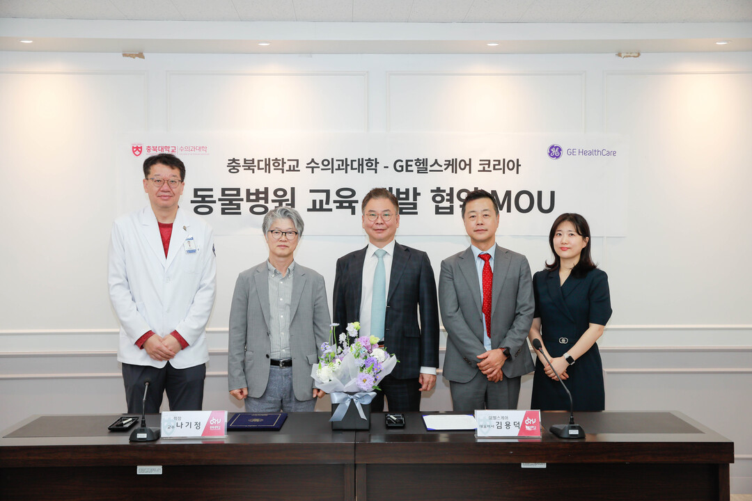 [대학저널 이선용 기자] 충북대학교 수의과대학이 지난 5월 29일 수의과대학 교수회의실에서 GE헬스케어 코리아와 ‘동물 진료를 위한 의료기기 전문 교육 프로그램 개발’을 위한 업무협약을 체결했다.