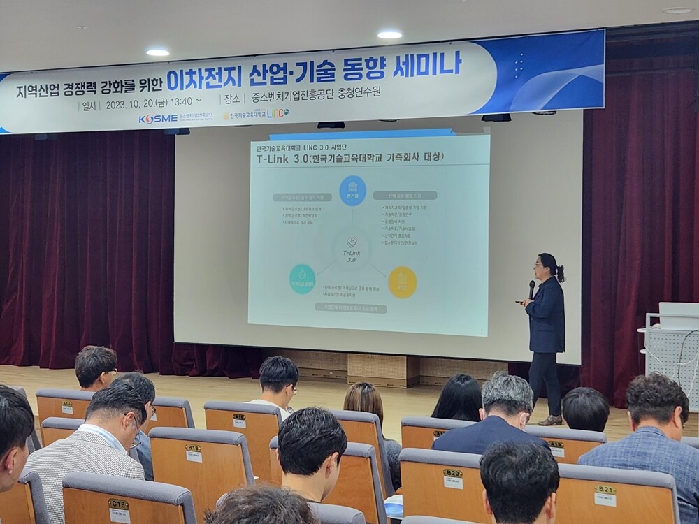 [대학저널 온종림 기자] 한국기술교육대학교 LINC 3.0사업단이 20일 중소벤처기업진흥공단과 함께 천안 충청연수원에서 ‘충청지역 산업 경쟁력 강화를 위한 이차전지 산업·기술 동향 세미나’를 개최했다.