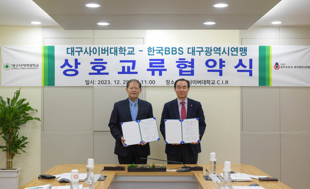 [대학저널 이선용 기자] 대구사이버대학교와 한국BBS대구광역시연맹이 지난 12월 29일 대학 CIR회의실에서 상호 교류 협약을 체결했다.