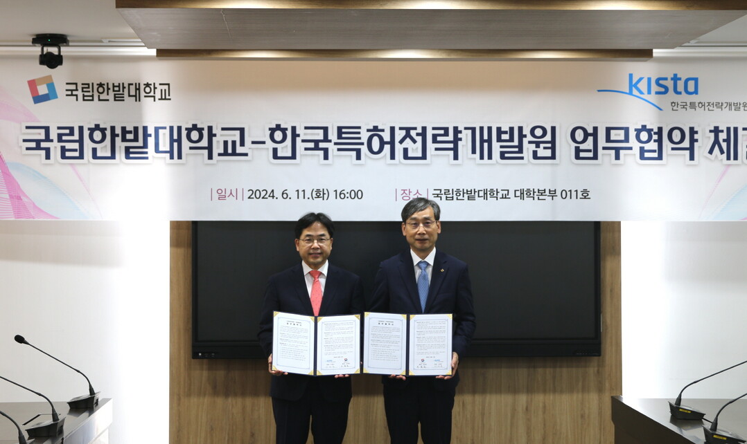 [대학저널 이선용 기자] 국립한밭대학교는 11일 교내 대학본부에서 한국특허전략개발원과 업무협약을 체결했다고 밝혔다.