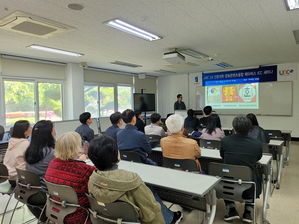 세미나에서는 문화콘텐츠 융합 메타버스 ICC 월드의 SOPT 플랫폼을 소개하며 올해 1학기 개설한‘메타버스와 디지털 인문 창업’과목의 창업강좌 소개 등 디지털 미디어 콘텐츠 산업과 관련된 내용의 발표와 토론이 진행됐다.