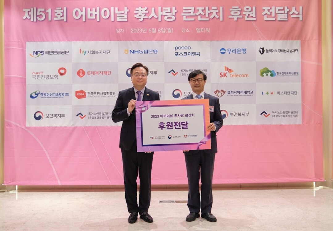 변창구(오른쪽) 경희사이버대 총장과 조규홍 보건복지부 장관이 지난 8일 서울 서초구 엘타워에서 열린 어버이날 효사랑 큰잔치 후원 전달식에서 전달증서를 들고 기념촬영하고 있다. 사진=독거노인종합지원센터 제공