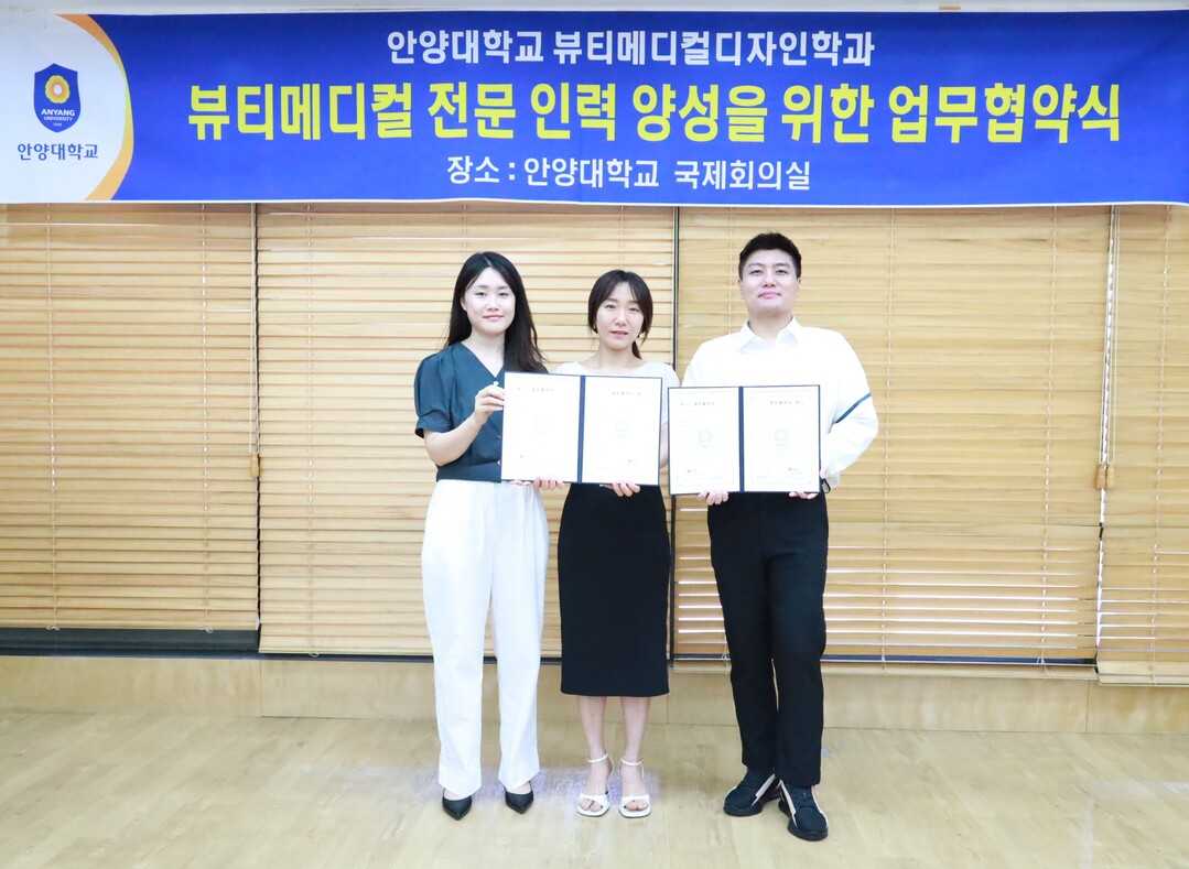 안양대 국제회의실에서 29일 열린 뷰티메디컬디자인학과와 아비쥬의원(범계)의 업무협약식에는 안양대 뷰티메디컬디자인학과 이여진 학과장과 위서현 교수, 아비쥬의원 범계 박성권 원장이 참석한 가운데 상호협력 방안이 적극 논의됐다.