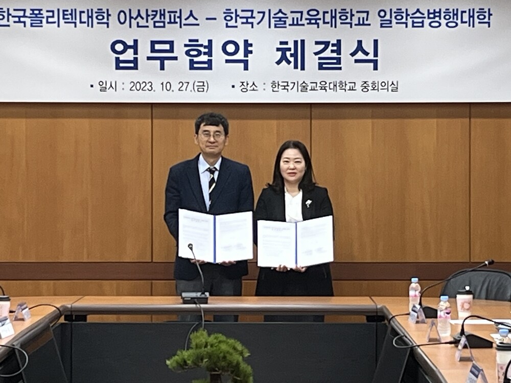 한기대 일학습병행대학이 27일 한국폴리텍대학 반도체융합캠퍼스 및 아산캠퍼스 산학협력처와 ‘일학습병행 경력개발고도화 사업을 위한 업무협약’을 체결했다. 사진=한기대 제공 |