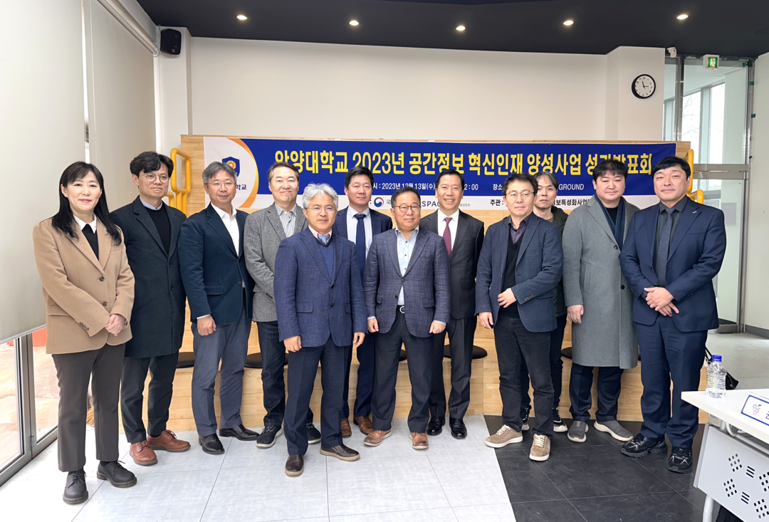 ‘2023년 공간정보 혁신인재 양성사업 성과발표회’에서 특성화대학 운영위원들이 기념촬영을 하고 있다. 사진=안양대 제공 |