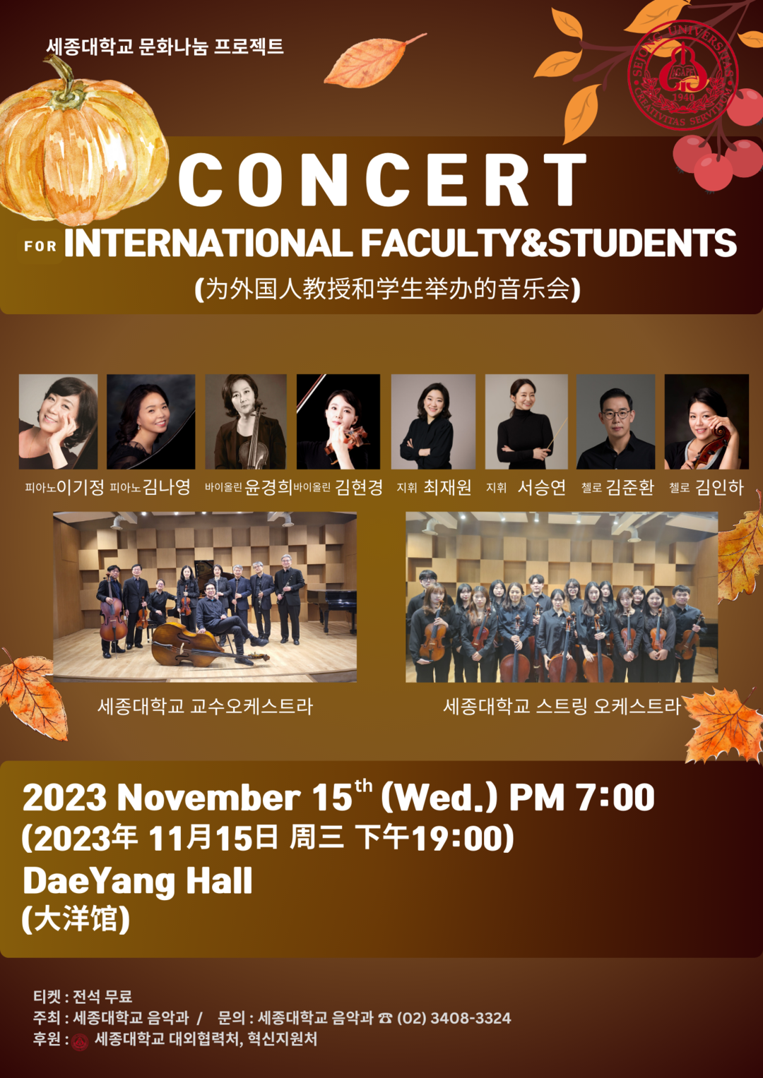 이번 음악회 티켓은 전석 무료이며, 선착순으로 외국인 학생 70명에게는 대외협력처에서 제공한 텀블러를 증정한다.
