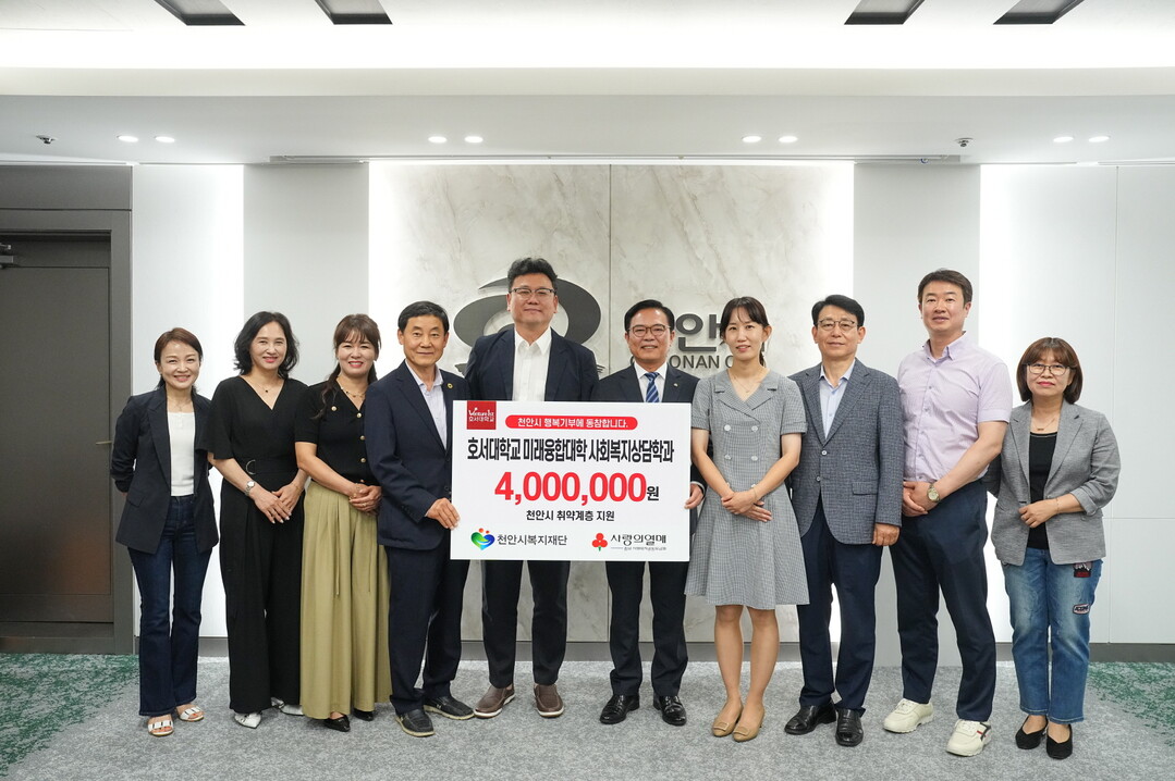 [대학저널 이선용 기자] 호서대학교 미래융합대학 사회복지상담학과가 바자회를 통해 마련한 기금 400만 원을 천안시복지재단에 기부하며 지역사회 나눔 실천에 나섰다.