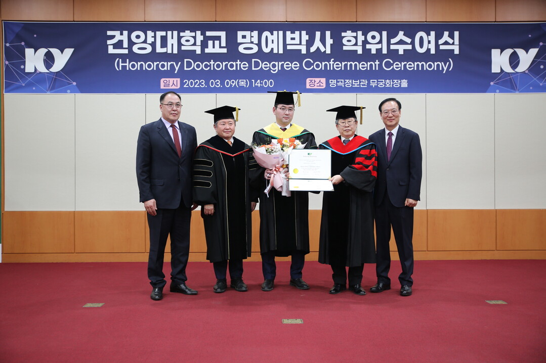 김용하(왼쪽에서 두번째) 건양대 총장과 건양대에서 명예박사 학위를 받은 오윤겔 바토르속트(가운데) 국립몽골생명과학대 총장 등이 명예박사 학위 수여식이 끝난 뒤 기념촬영하고 있다. 사진=건양대 제공 |