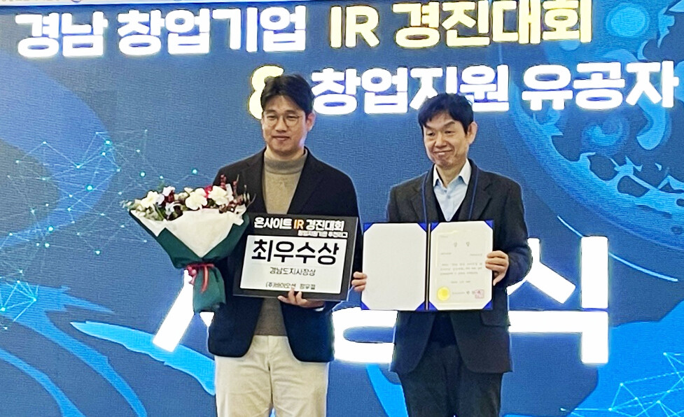 2023 경남 창업기업 IR 경진대회에서 최우수상을 수상한 ㈜바이오션 정우철 대표(왼쪽). 사진=경상국리대 제공 |