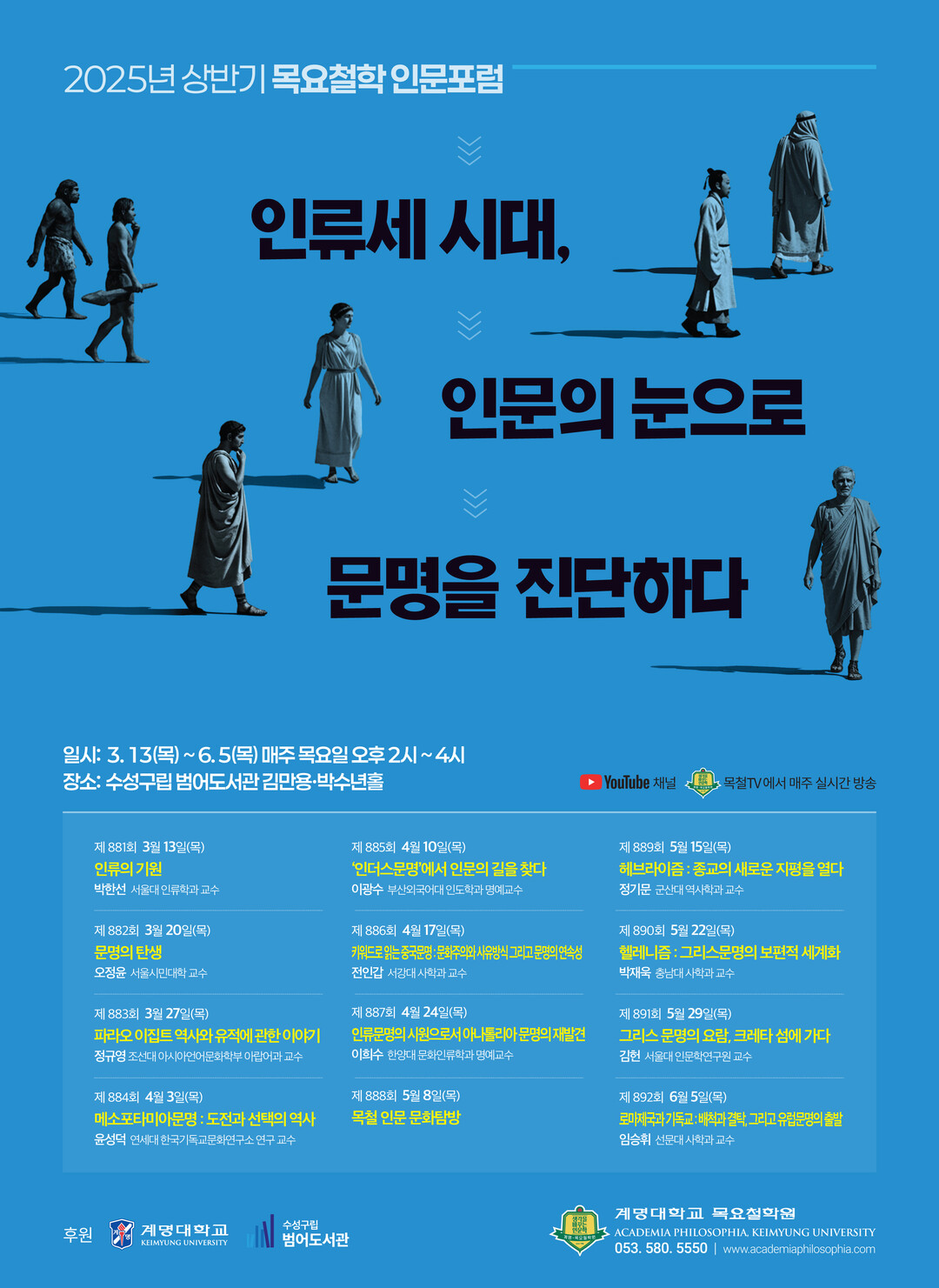 첫 포럼은 박한선 서울대 인류학과 교수의 “인류의 기원”이란 주제로 열린다. 이후 매주 목요일 ▲문명의 탄생(오정윤 서울시민대학 교수) ▲파라오 이집트 역사와 유적에 관한 이야기(정규영 조선대 아랍어과 교수) ▲메소포타미아 문명: 도전과 선택의 역사(윤성덕 연세대 한국기독교문화연구소 교수) ▲‘인더스문명’에서 인문의 길을 찾다(이광수 부산외대 인도학과 명예교수) ▲키워드로 읽는 중국문명: 문화주의와 사유방식 그리고 문명의 연속성(전인갑 서강대 사학과 교수) ▲인류문명의 시원으로서 아나톨리아 문명의 재발견(이희수 한양대 문화인류학과 명예교수) ▲헤브라이즘: 종교의 새로운 지평을 열다(정기문 군산대 역사학과 교수) ▲헬레니즘: 그리스 문명의 보편적 세계화(박재욱 충남대 사학과 교수) ▲그리스 문명의 요람, 크레타 섬에 가다(김헌 서울대 인문학연구원 교수) ▲로마제국과 기독교: 배척과 결탁, 그리고 유럽문명의 출발(임승휘 선문대 사학과 교수)의 순서로 포럼이 열린다.