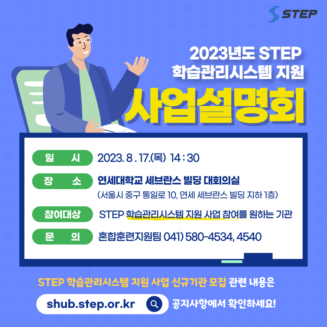 서울 연세대학교 세브란스 빌딩 대회의실에서 열리는 설명회에선 STEP 소개와 학습관리시스템 운영사례, 2023년 신규기관 모집 등에 관한 사항을 소개할 예정이다.