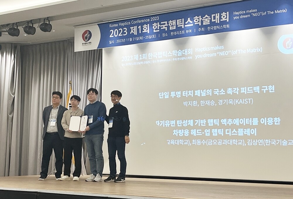 또한 허용해·이석한·정승환·정은진 대학원생은 ‘햅틱스 아이디어 경진대회’에서 ‘VR컨트롤러를 위한 형상 기억 합금과 자기유변 탄성테 기반의 초소형 근감각 햅틱 액추에이터’ 논문으로 LG전자 부문 장려상을 수상했다.