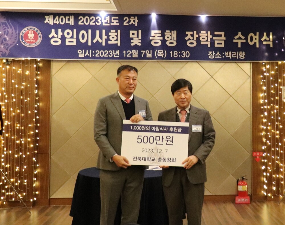 전북대 총동창회 최병선 회장은 7일 오후 6시 30분 열린 총동창회 상임 이사회에서 천원의 아침밥을 위한 기금을 전달받았다.