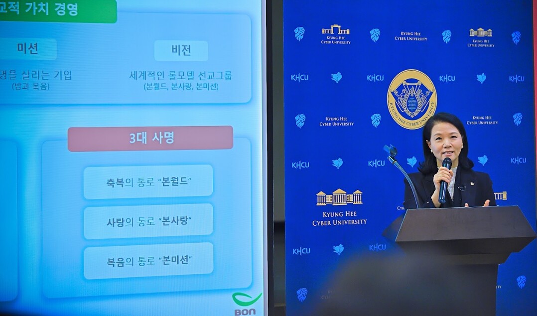 [대학저널 온종림 기자] 경희사이버대학교는 호텔관광대학원 호텔외식MBA전공이 지난 25일 최복이 본월드 본죽 대표이사를 초청해 ‘성공보다 사랑’을 주제로 특강을 했다고 29일 밝혔다.