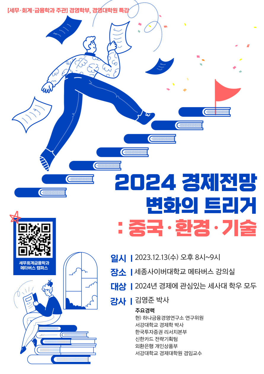 세무회계금융학과 학과장 김유진 교수는 “2024년 갑진년 새해를 앞두고 장기적 안목에서 우리나라의 경제 및 산업지형의 변화를 점검하는 시간이 되길 바란다”며 특강에 참여한 학우들을 응원했다.