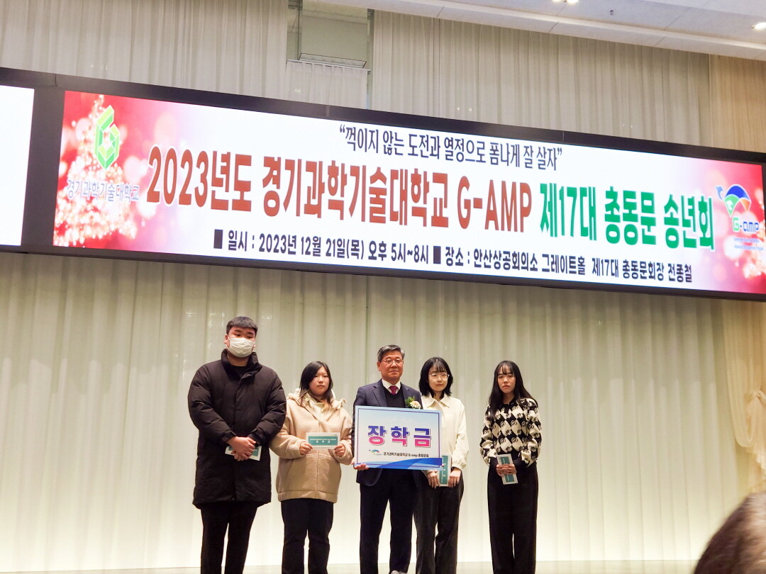 이번 경기과기대 G-amp 최고경영자과정은 제17대 총동문회 송년의 밤을 기념해 미래전기자동차과 장진석, 웹툰일러스트학과 정소윤, 게임콘텐츠학과 최다온, 홍채원 학생에게 총 200만원의 장학금을 수여했다.