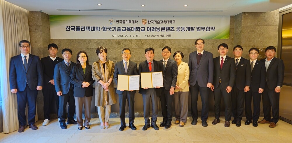 [대학저널 온종림 기자] 한국기술교육대학교(KOREATECH)가 한국폴리텍대학과 16일 서울 용산구 이태원 몬드리안 회의실에서 이러닝 콘텐츠 공동 개발을 위한 업무협약(MOU)을 체결했다. 고용노동부 산하 국책대학 2곳이 디지털 기반 직업훈련 활성화에 적극 협력하기로 뜻을 모았다는 점에서 의미가 크다.