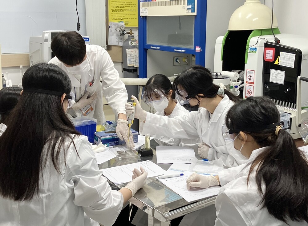 2023년 순천향 청소년 과학캠프에 참가한 학생들이 환경보건학과 실험실에서 ‘가정용 회로 시험기를 응용한 수질오염 측정’ 체험 프로그램에 참여하고 있다. 사진=순천향대 제공 |