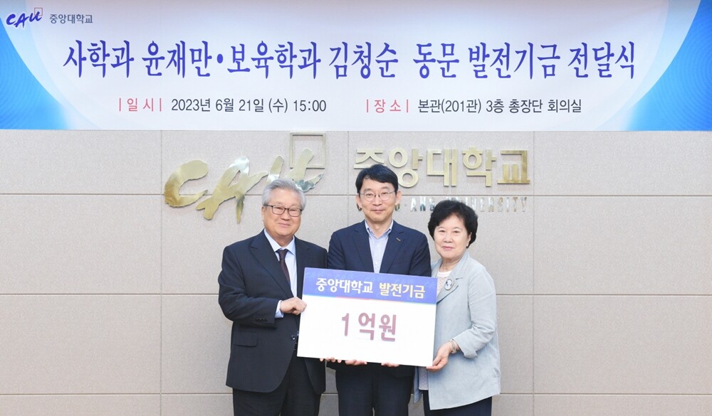 중앙대는 윤재만·김청순 동문 부부가 발전기금으로 1억원을 기부해 전달식을 지난 21일 서울캠퍼스 총장단 회의실에서 했다고 23일 밝혔다.