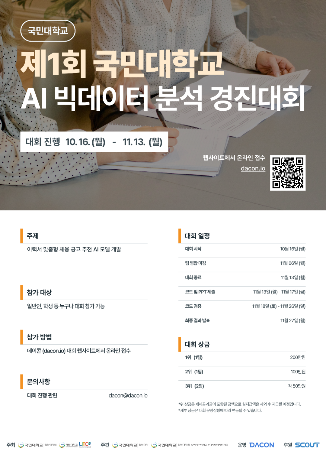 Total HR Service를 제공하는 ㈜스카우트의 후원을 받아 진행되는 이번 대회는 유연한 노동시장으로의 변화 흐름에 맞추어, 채용 공고 추천 알고리즘을 제안하는 것을 목표로 기획됐다.