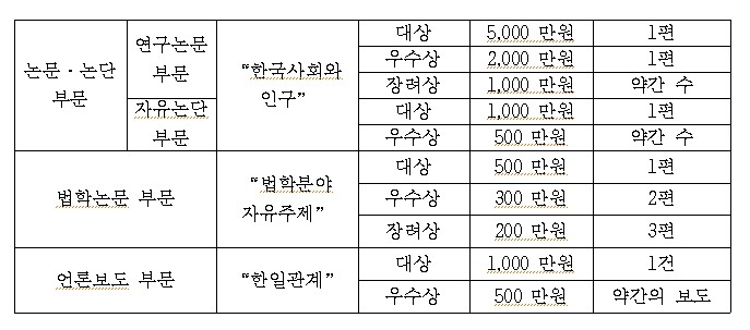 특히 논문·논단부문(주제:한국사회와 인구)의 자유논단 부문의 응모대상에는 신문, 잡지 등 정기간행물에 게재된 특집·기획 기사 등도 포함된다.