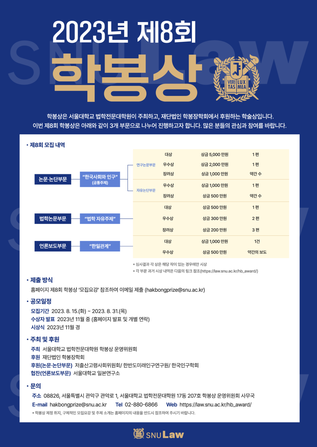올해에는 기존 연구논문 부문을 논문·논단부문으로 새롭게 개편하고, 각각 연구논문 부문과 자유논단 부문으로 각각 모집할 예정이며, 법학전문대학원 학생들을 대상으로 한 법학논문 부문과 언론보도 시상을 위한 언론보도 부문을 함께 모집할 예정이다.