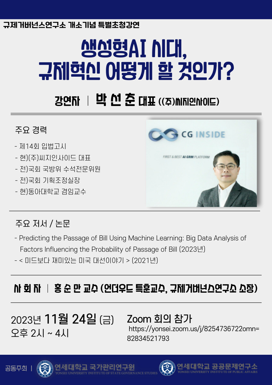 [대학저널 이선용 기자] 연세대학교 국가관리연구원이 11월 24일 오후 2시 규제거버넌스연구소 개소를 기념해 박선춘 (주)씨지인사이드 대표를 초청해 특별강연을 개최한다.