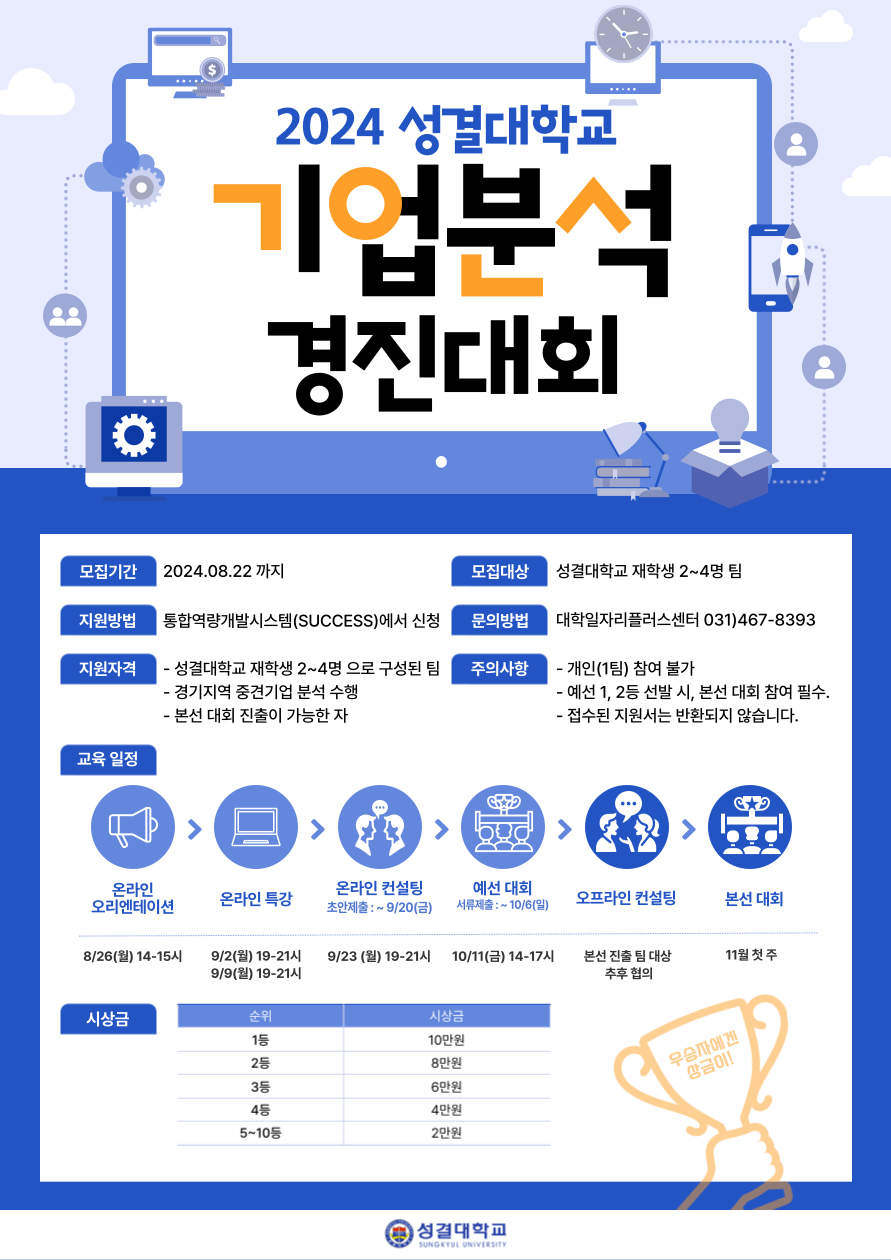 한편, 2024 성결대 기업분석 경진대회의 교육 순서는 대회 준비를 위한 온라인 오리엔테이션을 시작으로 전문가 특강과 온라인·오프라인 컨설팅이 진행되며 10월에는 예선 대회를 통해 본선 진출 팀을 선발한다.