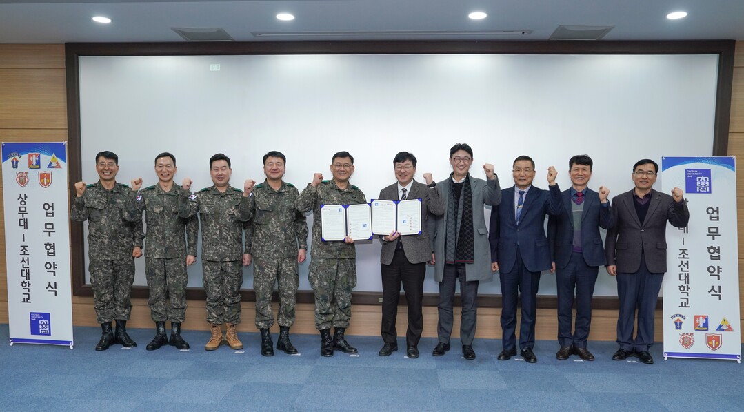 조선대와 상무대 관계자들이 지난 10일 업무협약을 체결한 후 기념촬영을 하고 있다. 사진=조선대 제공 |