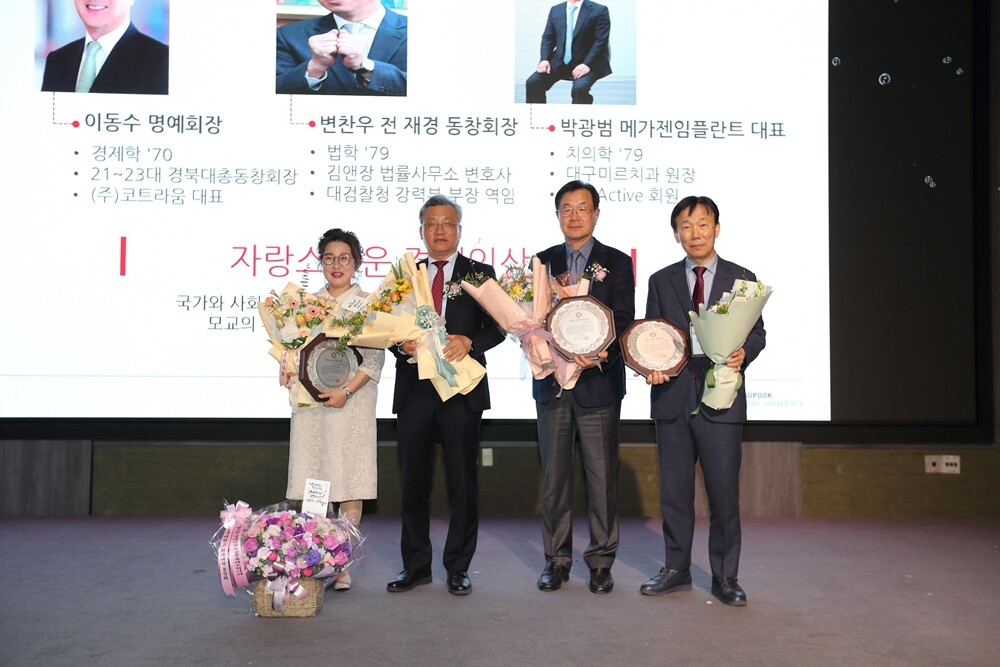 경북대총동창회는 또 이동수(경제학 ‘70) 총동창회 명예회장, 변찬우(법학 ‘79) 전 재경 동창회장, 박광범(치의학 ‘79) 메가젠임플란트 대표 등 3명에게 자랑스런 경대인상을 시상했다.