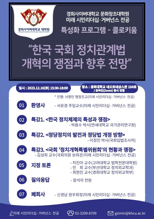 프로그램 관련 자세한 문의는 경희사이버대 문화창조대학원 미래 시민리더십·거버넌스 전공 사무실로 문의하면 된다.