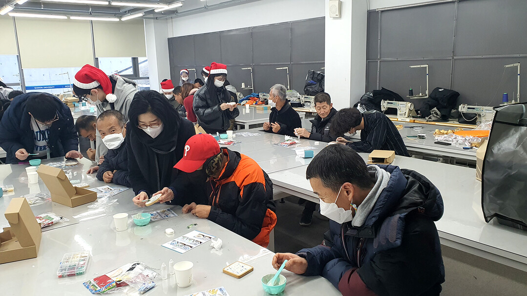 패션의류학과는 에덴원 가족을 대학으로 초청, 크리스마스를 앞두고 크리스마스 트리 무드등 만들기, 니트 모자 만들기, 에코백 만들기 등 체험 프로그램을 진행했다.