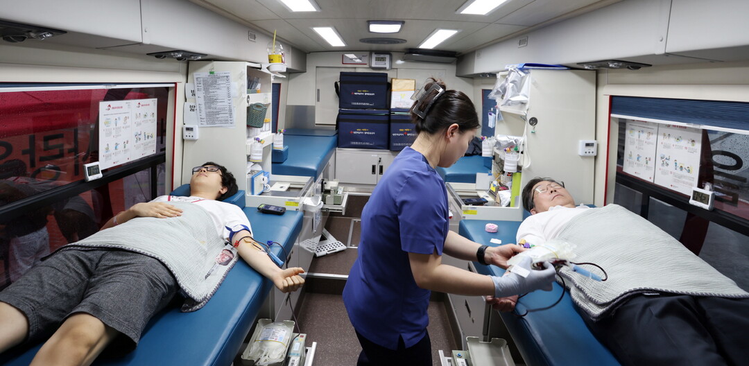 김동원 고려대 총장(오른쪽)이 학생들과 함께 헌혈버스에서 헌혈하고 있다. 사진=고려대 제공 |