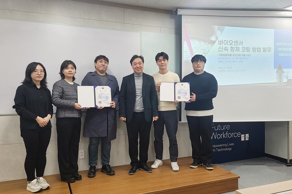 메디컬IT융합공학과 4학년 장종민, 김대일, 남유선, 서채원 학생은 참여기업 엔디디와 팀을 이뤄 바이오센서 신속항체 코팅방법 발명을 통해 상을 받았다.